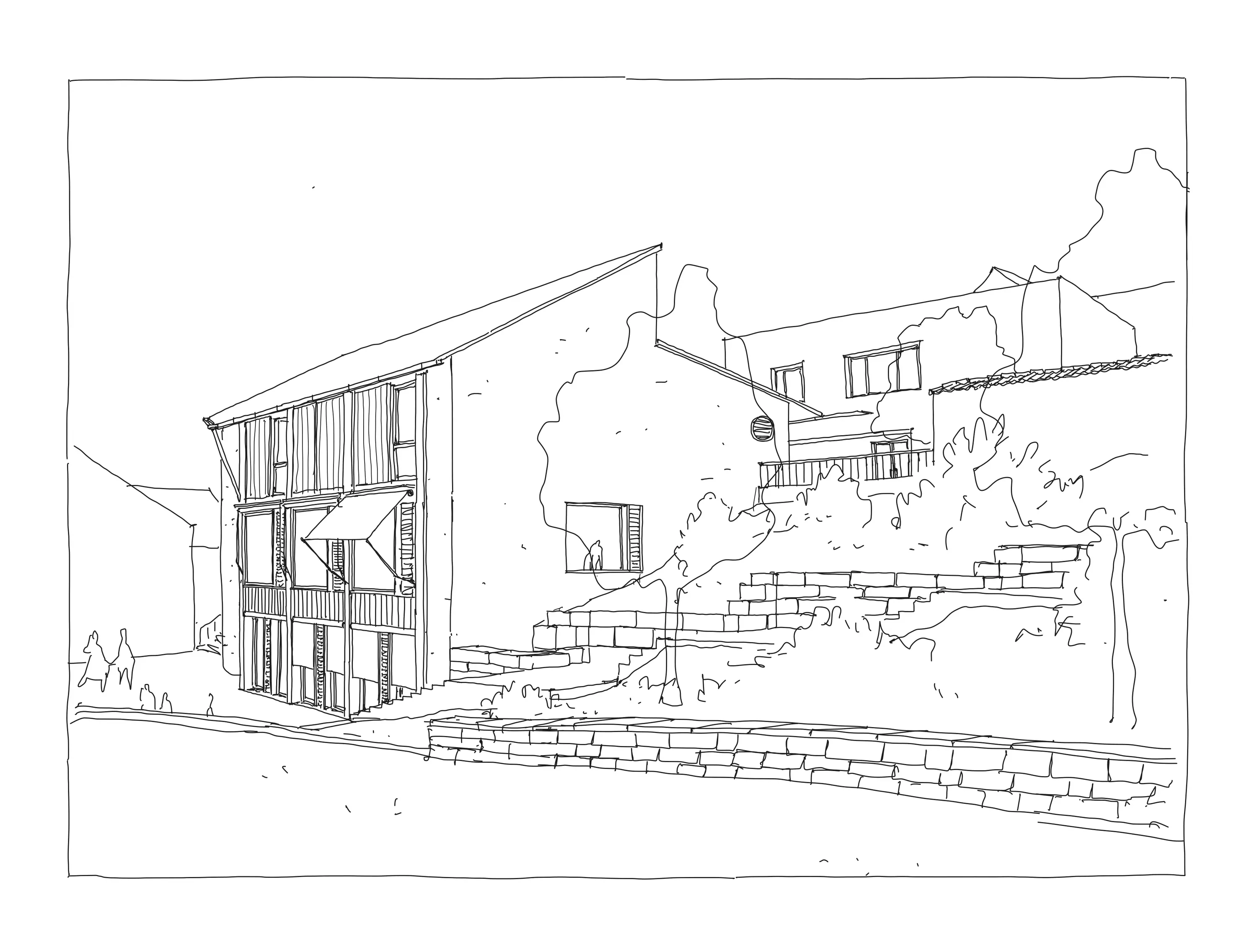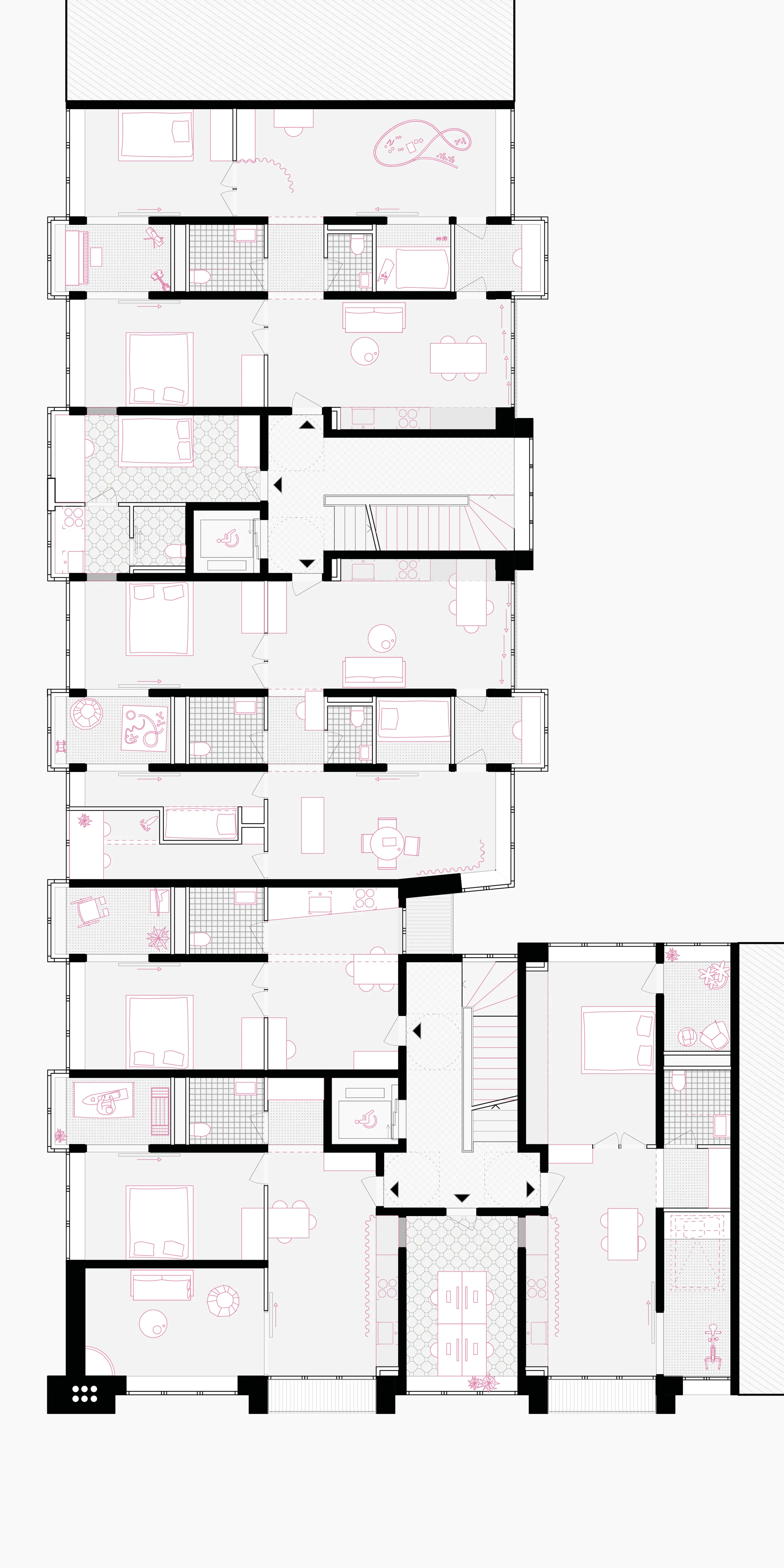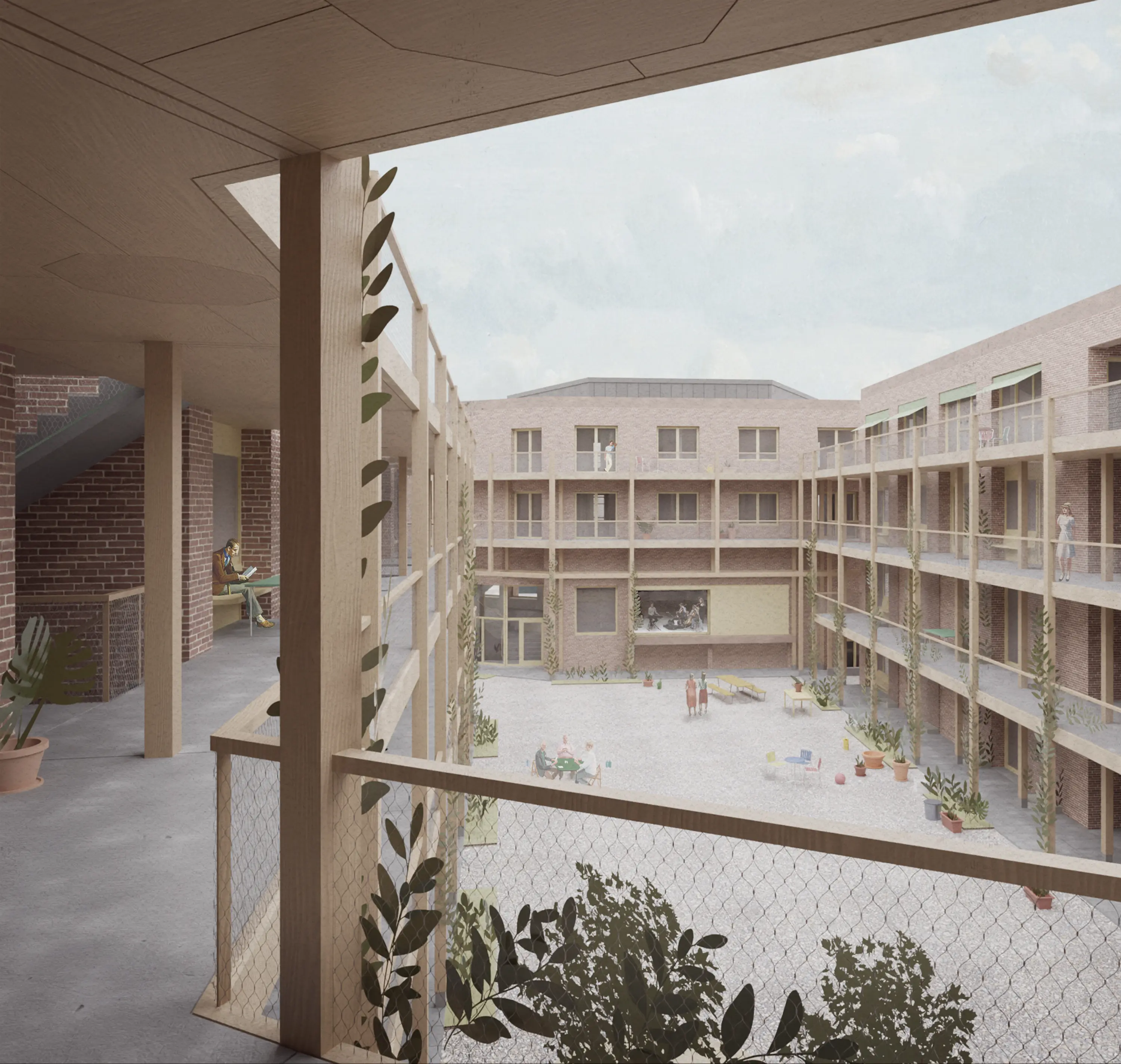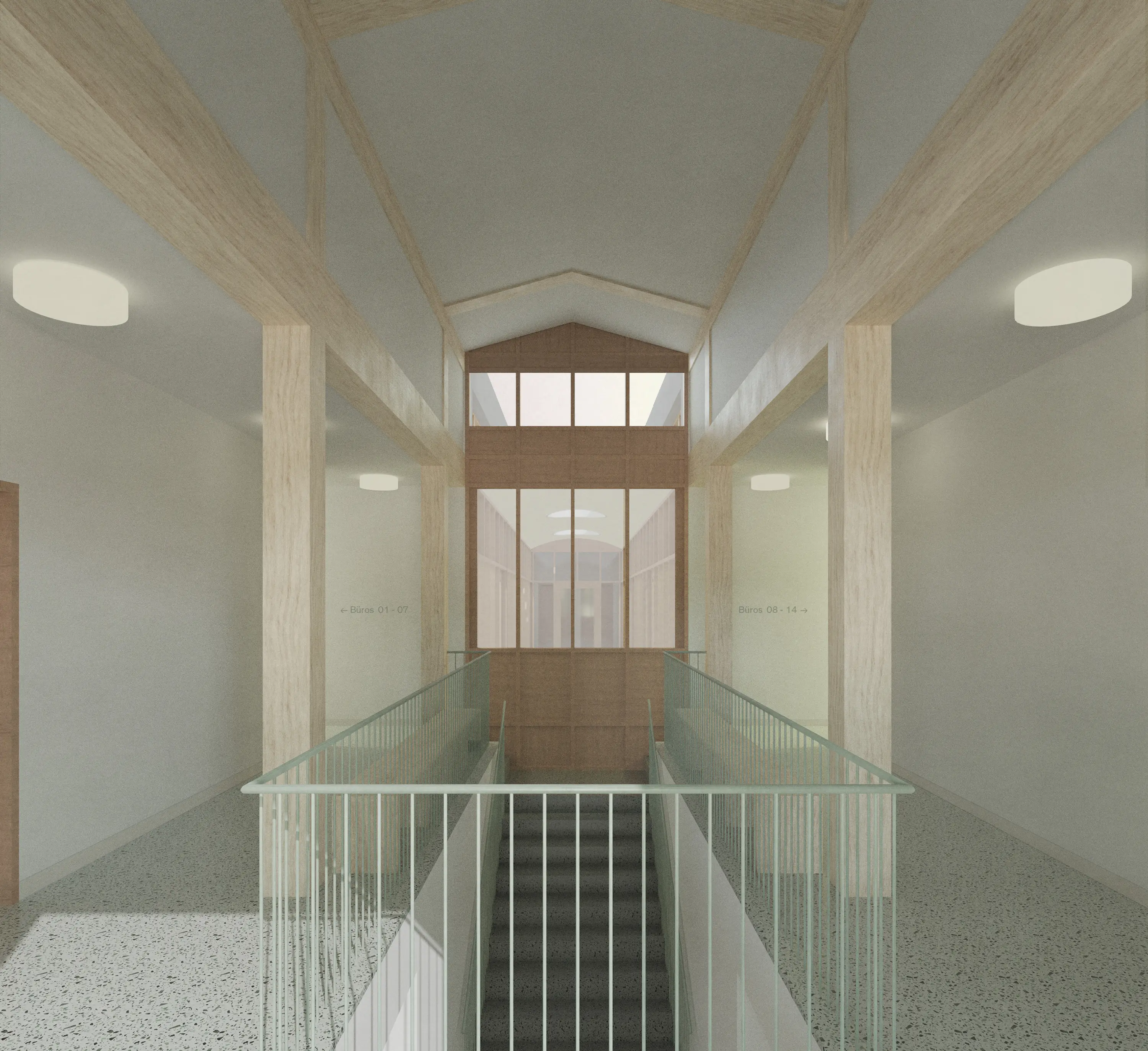 Das Gefüge aus drei Baukörpern wird durch eine kollektiv aneigenbare, leichte Laubengangschicht miteinander verbunden. Die Volumen der Gebäude treten in einen bewussten Dialog mit den für Hamburg typischen, schweren Wohnhäusern der Umgebung.