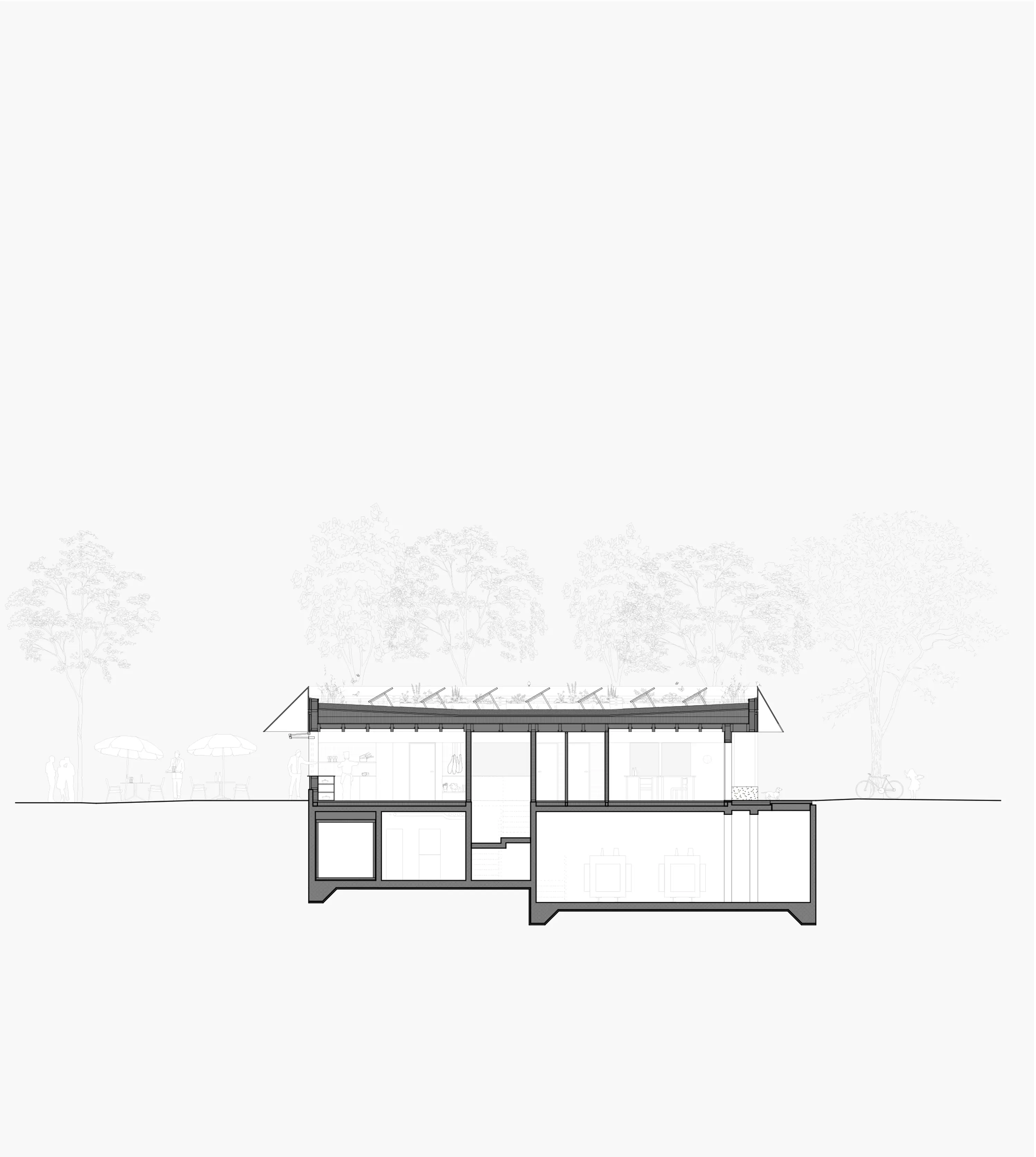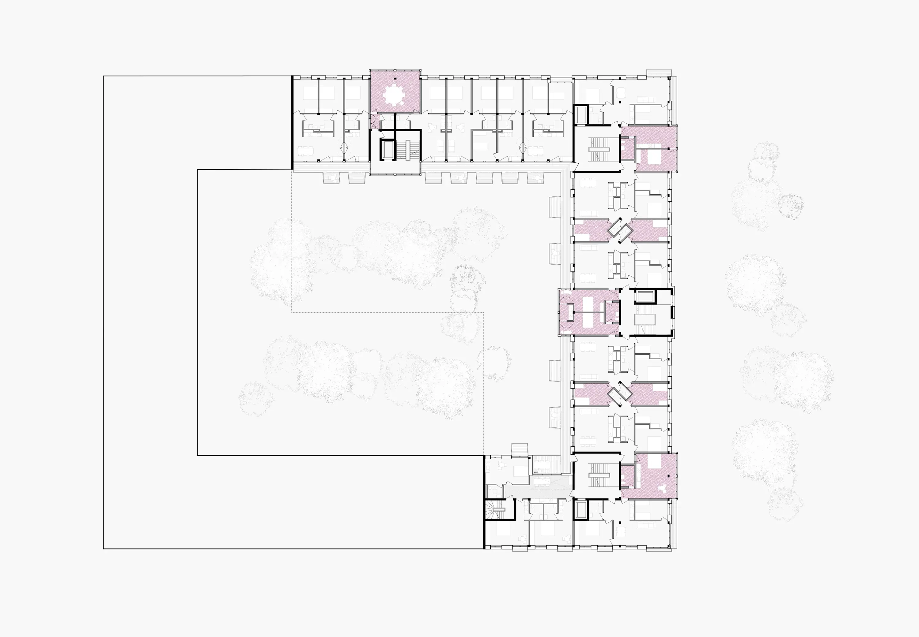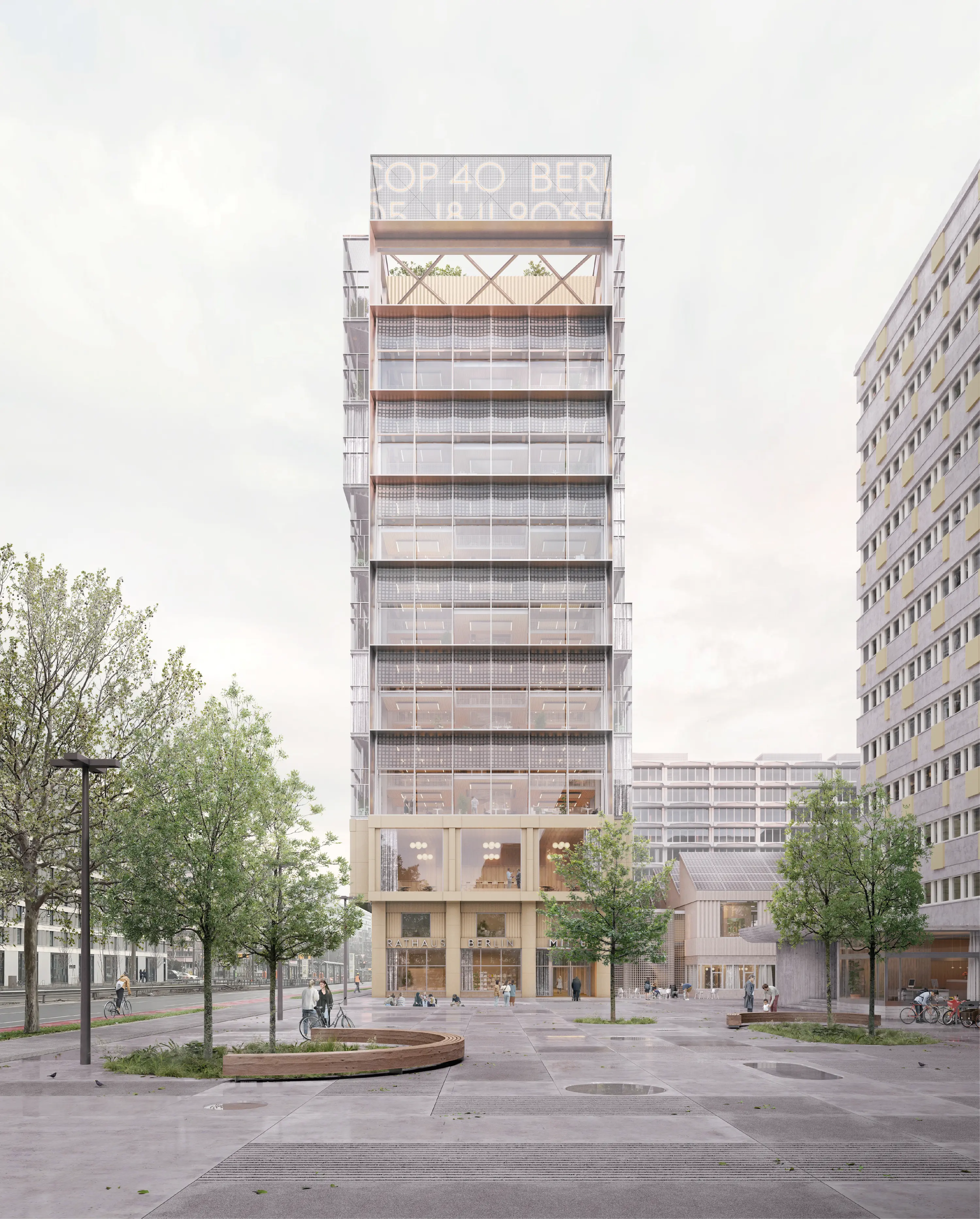 Das Gefüge aus drei Baukörpern wird durch eine kollektiv aneigenbare, leichte Laubengangschicht miteinander verbunden. Die Volumen der Gebäude treten in einen bewussten Dialog mit den für Hamburg typischen, schweren Wohnhäusern der Umgebung.